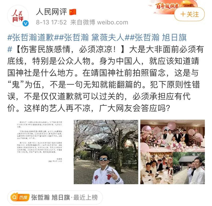 近日有网友爆料称,艺人张哲瀚在2019年年底曾参加朋友在日本乃木神社举办的婚礼,2018年还发布过在靖国神社前的留影。此事引发巨大争议。