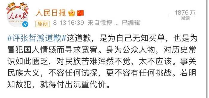 @人民日报 :这道歉,是为自己无知买单,也是为冒犯国人情感而寻求宽宥。身为公众人物,对历史常识如此匮乏,对民族苦难浑然不觉,太不应该。事关民族大义,不容任何试探,更不容有任何挑战。若明知故犯,就得付出沉重代价。”