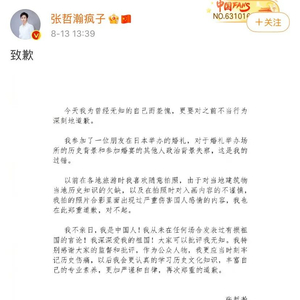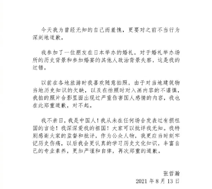 13日中午,张哲瀚通过微博发文:“今天我为曾经无知的自己而羞愧,更要对之前不当行为深刻地道歉。”
