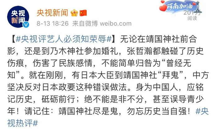 @央视新闻:【艺人必须知荣辱】无论在靖国神社前合影,还是到乃木神社参加婚礼,张哲瀚都触碰了历史伤痕,伤害了民族感情,不能简单归咎为“曾经无知”。就在刚刚,有日本大臣到靖国神社“拜鬼”,中方坚决反对日本政要这种错误做法。身为中国人,应铭记历史,砥砺前行;绝不能是非不分,甚至误导青少年!请记住:靖国神社尽是鬼,勿忘历史当自强!