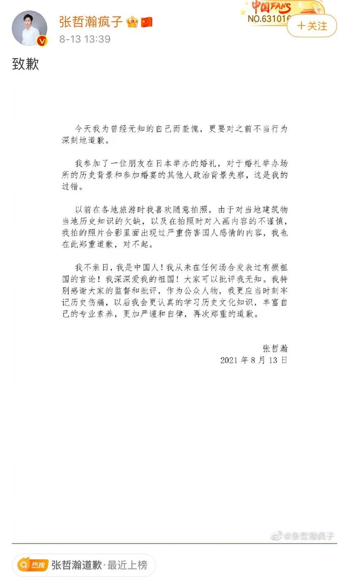 8月13日,艺人张哲瀚发文道歉↓
