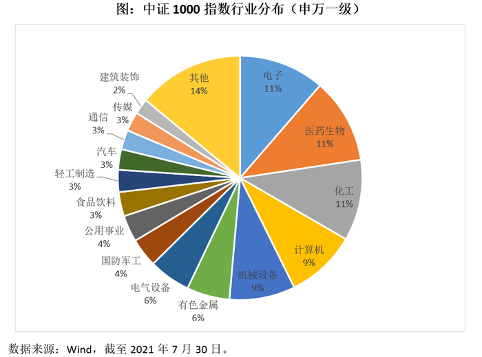 相比上证50、沪深300等指数行业以金融地产为主,中证1000指数行业分布非常均衡,以电子、医药生物、计算机等成长性较强的细分领域以及化工、机械设备、有色金属等周期行业为主,同时行业分布也相对较为分散。按照申万一级行业分类,指数中权重占比最大的行业分别是电子(11%)、医药生物(11%)和化工(11%)。总体而言,中证1000指数成份股大多属于成长性较高、盈利能力强的行业,与我国科技、制造强国的战略发展方向相契合。