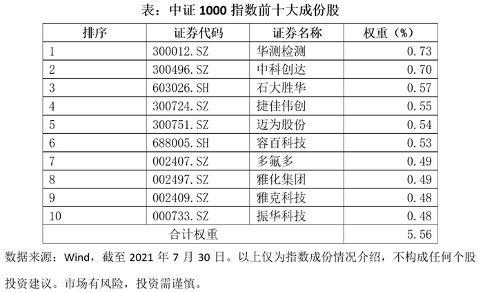就成份股权重分布而言,由于中证1000指数成份股数量多达1000只,所以个股分布十分均衡,有利于分散风险。其中权重第一大成份股华测检测占比为0.73%,权重前10大成份股占比合计5.56%。指数分散的权重分布能够有效地反映沪深市场小市值上市公司的整体走势,不会如其他宽基指数一样被少数重仓股主导。