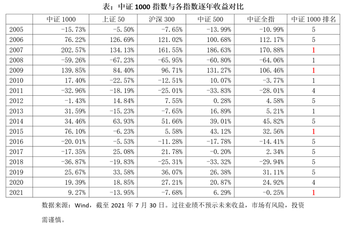 就收益率而言,中证1000指数自基日(2004.12.31)以来至2021年7月30日,累计收益率达到626%,年化收益率13.20%,领先同期上证50、沪深300、中证500、中证全指等市场代表性宽基指数。