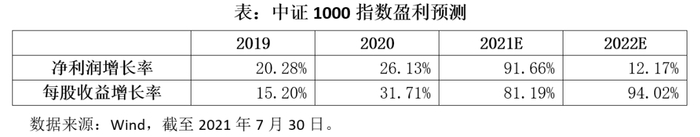 细分行业高景气度也推动了整个中证1000指数在未来两年内维持较好的成长性,2021年和2022年中证1000指数预期净利润增长率或将分别达到91.66%和12.17%,预期每股收益增长率也或将分别达到81.19%和94.02%。
