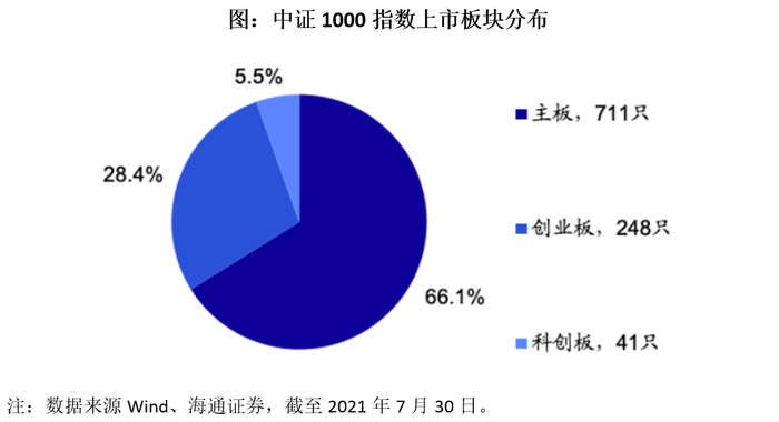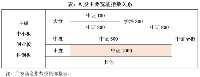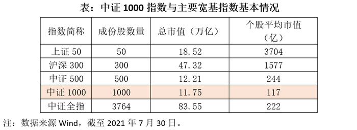 该指数于2014年10月17日由中证指数公司发布,以2004年12月31日为基日,基点为1000点。相较于沪深300大蓝筹以及中证500中盘股的特征,中证1000指数呈现出显著的小盘股特征,截至2021年7月30日,其总市值11.75万亿,个股平均市值117.50亿。中证1000指数与中证100、沪深300、中证500、创业板以及科创板等指数共同组成了A股市场最为核心的宽基指数体系。