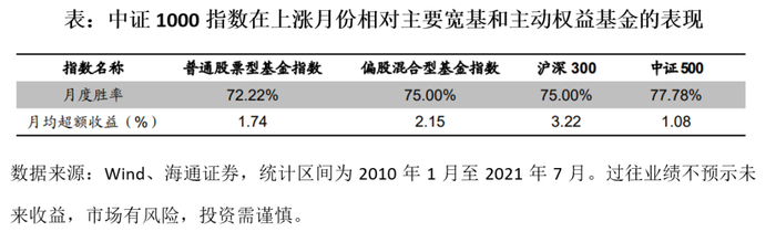 我们统计了2010年以来,中证1000指数在上涨月份相对主要宽基指数和主动权益基金指数的胜率及月均超额收益。结果表明,指数涨幅相对沪深300、中证500指数和主动权益基金指数的胜率均超出70%。即牛市行情中中证1000指数具备较高弹性,能够更好地捕捉市场上涨收益。