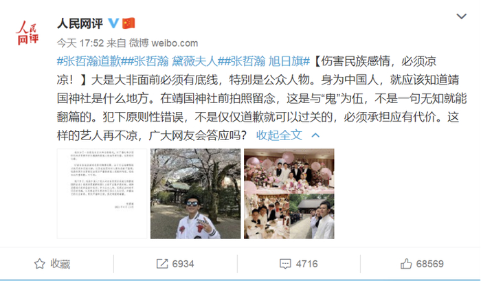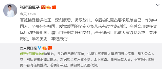 随后,张哲瀚也在个人微博转发了@人民日报 该篇评论,并写道:“真诚接受批评指正,深刻反思,汲取教训。今后会以更高要求规范自己,作为中国人,坚决拥护祖国,爱党爱国的坚定立场从未有过丝毫动摇,今后会用更多实际行动热爱祖国,履行自身的责任和义务,严于律己!也请大家以我为戒,关注历史,学习历史,牢记历史!”
