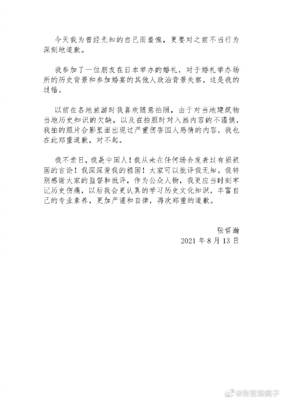 有网友日前爆料称,凭借《山河令》大火的演员张哲瀚曾在日本乃木神社、靖国神社拍照。8月13日下午,张哲瀚在其个人微博发布道歉声明,称“为曾经无知的自己而羞愧,更要对之前不当行为深刻地道歉”,并强调自己“不亲日”“是中国人”。其工作室也转发微博,道歉称“未来我们会跟他一起,完善专业知识,时刻牢记历史,坚决拥护祖国!祖国的利益高于一切!做任何事情都更严谨,更细致”。