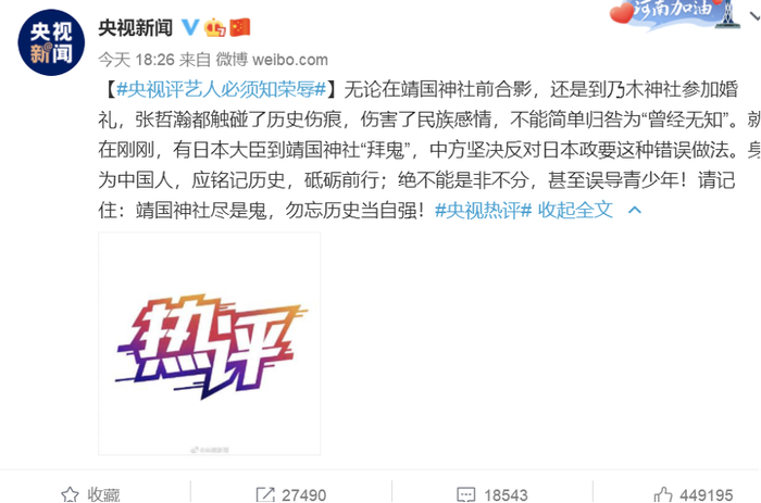 @央视新闻:无论在靖国神社前合影,还是到乃木神社参加婚礼,张哲瀚都触碰了历史伤痕,伤害了民族感情,不能简单归咎为“曾经无知”。就在刚刚,有日本大臣到靖国神社“拜鬼”,中方坚决反对日本政要这种错误做法。身为中国人,应铭记历史,砥砺前行;绝不能是非不分,甚至误导青少年!请记住:靖国神社尽是鬼,勿忘历史当自强!