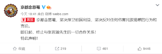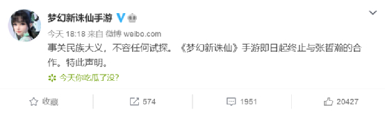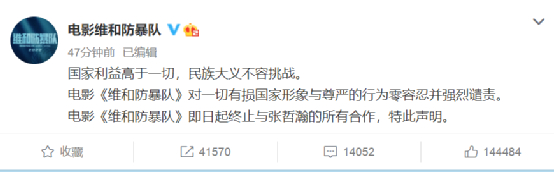 另外,张哲瀚参演的电影《维和防暴队》也于今天傍晚在微博上发表声明,称“国家利益高于一切,民族大义不容挑战”,“即日起终止与张哲瀚的所有合作”。