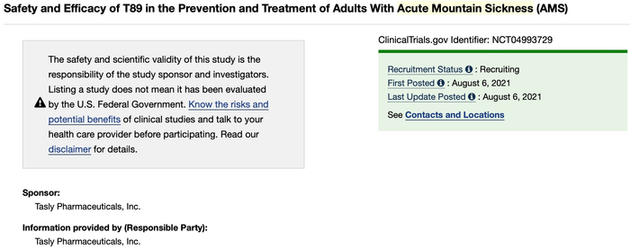 8月6日,国内知名医药上市公司天士力(600535.SH)在美国临床试验注册登记网站上登记了一项T89预防及治疗急性高原反应的III期临床研究。T89为天士力核心品种复方丹参滴丸在美国进行临床研究申报的代码。