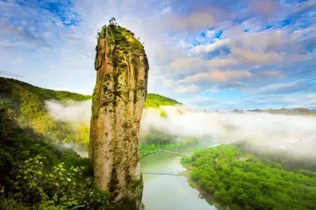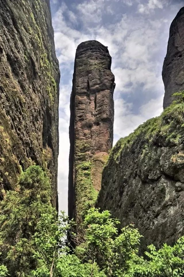 江郎山是中国最美九大丹霞地貌之一,是大自然的鬼斧神工之作。幽深的一线天、大段垂直的陡阶,其艰险绝不输华山。走在密林间,耳畔不仅有虫鸣鸟叫,还有清澈的十八曲山泉水。