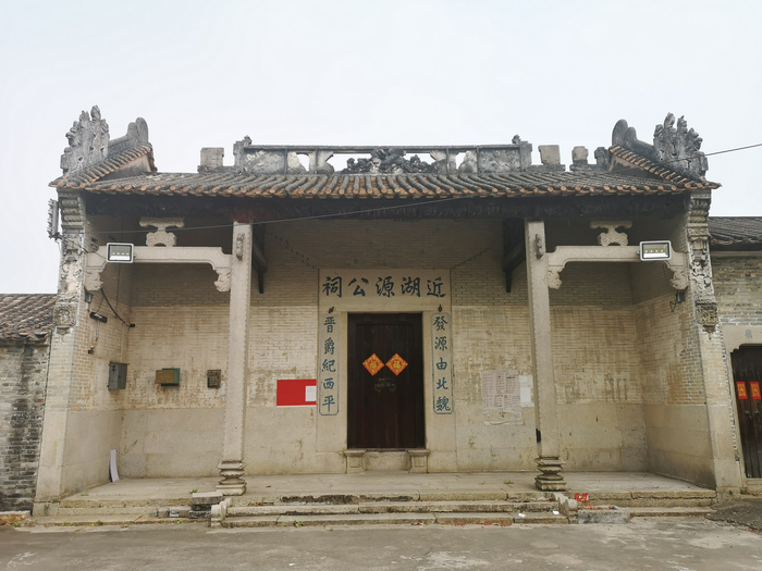 就在广场雕像对面的空地旁,古朴的近湖源公祠静静屹立。青石条地基,青砖墙身,顶端灰瓦。它的外观虽然普通,可大门两侧的对联却极具气魄,在我所去过的无数祠堂中也是数得着的——“发源由北魏,晋爵纪西平”,讲述的正是源贺在北魏时期先后进爵西平侯、西平郡公乃至西平郡王的历史。