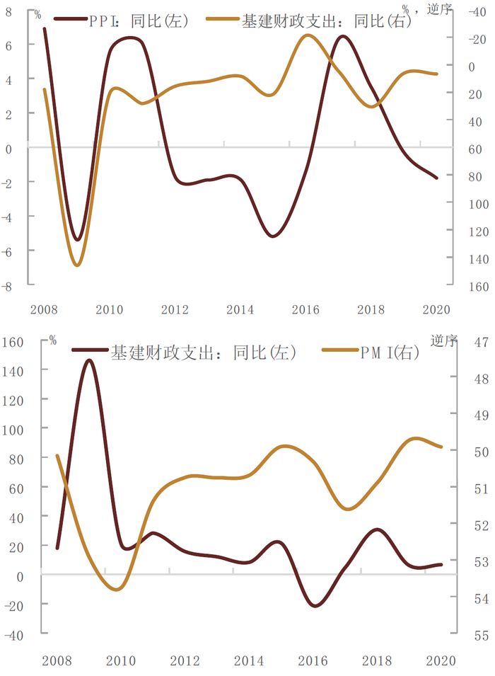 债券投资者目前主要担心的点在于,年初至今赤字和专项债额度使用都偏慢,后面经济若边际回落,财政会不会发力基建来支持。然而我们认为短时间内可能还不太会看到。历史上来看,基建相关财政支出增速与PPI以及PMI呈现一定反向相关关系(图19),基建作为稳增长的逆周期调节工具,往往在经济出现比较明显下行压力的时期,财政资金才会明显向基建倾斜;况且,在工业品价格维持高位的时期刺激基建,可能会进一步推升PPI。因此,如果要重新刺激基建,可能需要看到PPI和PMI数据出现比较明显的下行。然而今年PPI维持高位,而PMI尽管出现了一定回落,但持续维持在景气度扩张区间,在这种情况下,财政资金可能不存在明显向基建投资倾斜的基础,这也是为何今年财政发力方向依然是以稳民生为主。整体来看,在实体经济资本回报下降、经济动能走弱而货币政策边际放松的情况下,债券利率的下行仍有一定的空间。