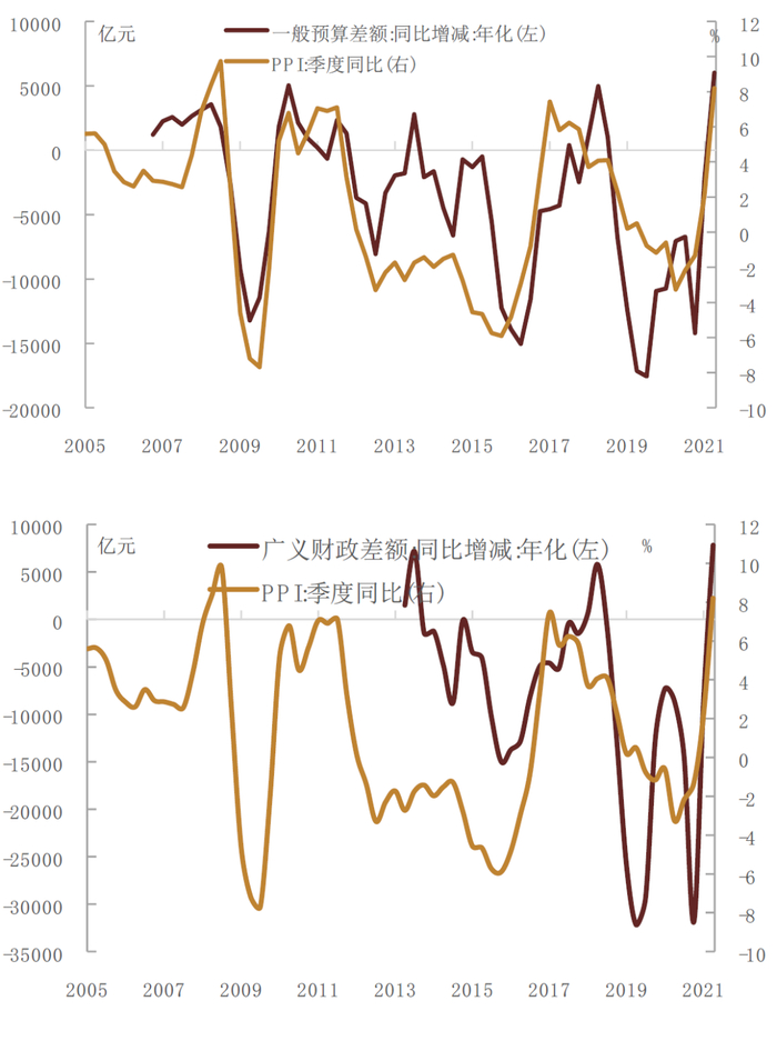 此外,历史上来看,预算内财政收支差额以及广义财政收支差额均与PPI走势高度相关(图3),这是因为PPI维持高位的年份,税收也会维持较高水平,因此财政收入会得到支撑,财政收入覆盖财政支出的能力增加,通过赤字填补收支差额的必要性下降,赤字往往不会用足。因此我们可以看到,在2007年、2010-2011年,经济增长较快,PPI维持高位,这三年的财政收入增速分别达到32.4%、21.1%和24.8%,明显超过当年收入目标,也足够覆盖全年的财政支出计划。因此在这些年份,赤字未用足的情况就较为突出。