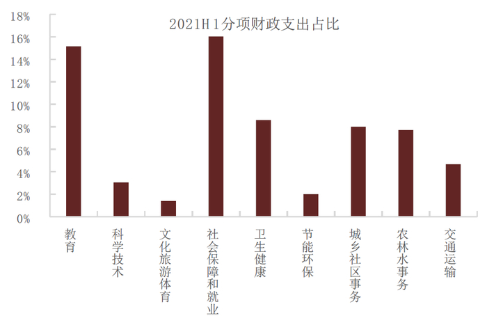 在下半年财政收入和政府性基金收入都可能边际放缓的情况下,基建投资的支撑力度可能会进一步下降。从上半年财政支出分项来看,比较符合政策支持的向“三保”等重点领域倾斜,社会保障与就业、卫生健康、文化旅游体育和教育等基本民生相关支出维持较高增速(图12),占到上半年总支出的五成左右(图13)。由于财政支出明显向民生倾斜,上半年基建相关支出,例如交通运输、农林水事务等支出出现负增长,这与上半年基建投资增速偏弱也较为一致。而一旦财政收入增速回落,而专项债资金因为项目质量的限制也难以快速补充的话,基建投资可能会更难以支撑。