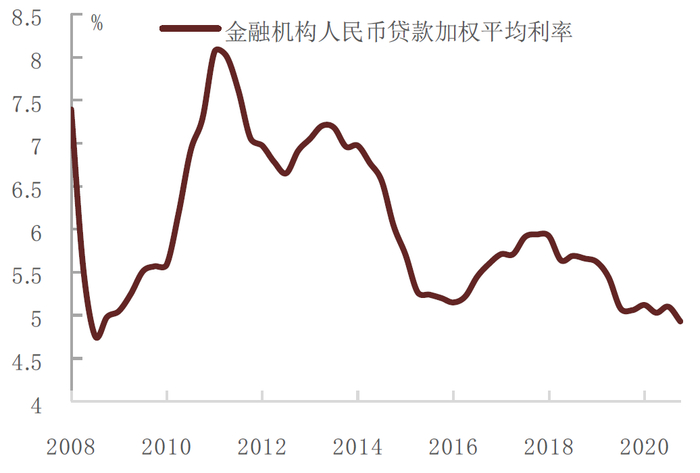 社融方面,按照政府工作报告的要求,社融增速与名义经济增长相匹配,今年名义GDP增速大约在10%附近,我们预计年内社融增速回落到接近10%的区间,对应社融全年增量29万亿元左右。照此计算,今年以(经常账户顺差+广义财政赤字)/当年社融增量来衡量的资本回报可能由去年的0.32回落至0.25左右。这样来看,2021年资本回报率可能会低于2020年,这也同样意味着经济动能边际回落。实际上,贷款利率的下行其实就是资本回报回落的一种本能反应。根据央行的二季度货币政策执行报告,2021年上半年,我国贷款加权平均利率为5.07%,较上年同期下降0.07个百分点,较上年全年下降0.08个百分点(图18)。一旦实体经济的资本回报下行,经济动能走弱,货币政策可能会在狭义流动性层面适当宽松对经济予以支持,例如金融危机之后以及2015年产能过剩之后,实体经济的资本回报均出现了一定程度的下行,而这些时期,央行货币政策都偏宽松以支持经济。