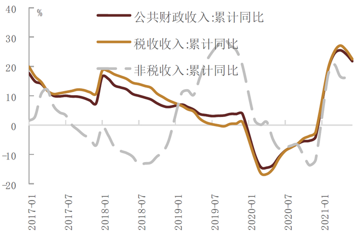 其次,下半年财政收入对于财政支出的支撑可能也会逐渐减弱。我们在前文提到今年上半年财政收入增速维持高增,主要是PPI维持高位以及经济回升带动了税收收入增长。今年上半年全国税收收入同比增长22.5%,即便考虑去年同期低基数,上半年税收收入较2019年同期也增长8.7%。此外,非税收入也受到增值税、消费税等税收加快的拉动同比增长17.4%,比如附征的教育费附加等增幅都比较明显(图10)。然而需要注意的是,一旦PPI逐渐高位回落,财政收入增速可能会有所放缓。在供给约束下,PPI持续维持高位,但随着后续下游地产等需求回落以及PPI基数的抬升,我们预计工业品供需格局会有所改善,下半年PPI增速会逐渐放缓,我们预计年末PPI增速可能逐渐回落至6%-6.5%左右。财政部相关负责人在上半年财政收支情况新闻发布会[4]上也表示:“从后期走势看,全球疫情形势依然严峻,国内经济恢复不均衡、基础不稳固问题依然存在,再加上去年下半年基数抬高,提高企业研发费用加计扣除比例并提前享受新增减税政策减收体现在今年下半年,预计今年下半年全国收入增幅将比上半年明显回落。但考虑到上半年收入完成进度较快,经过努力,预计能够完成全年预算收入目标。”