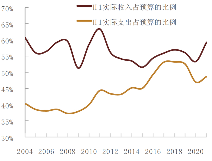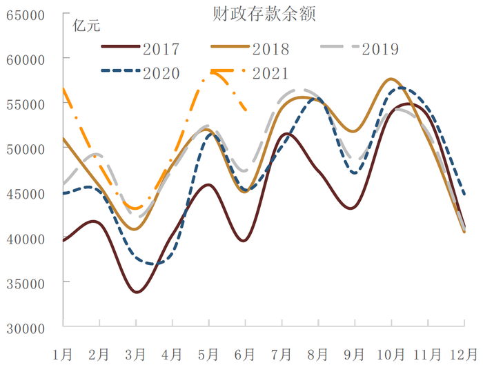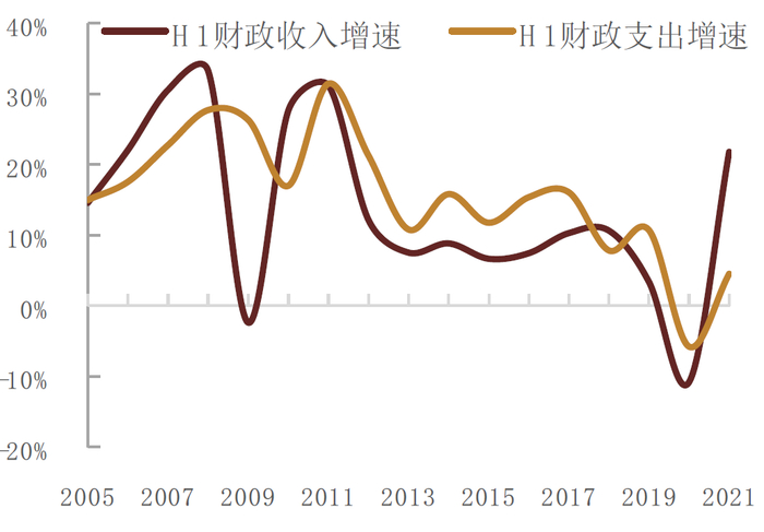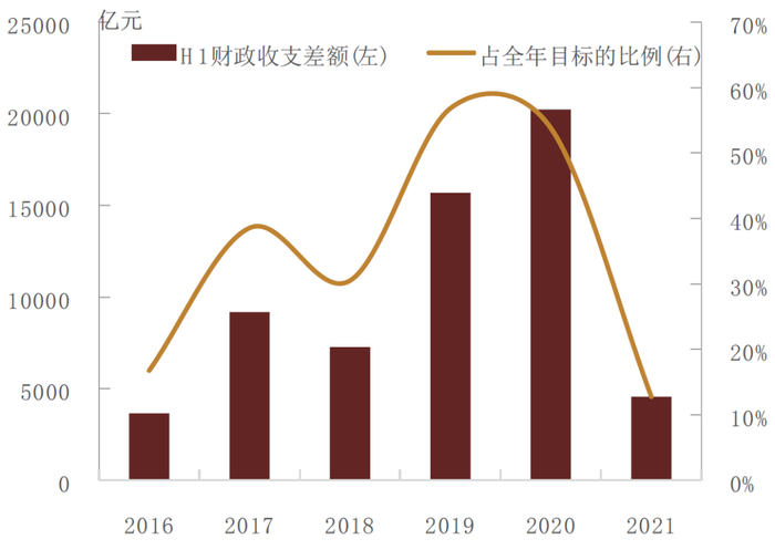 放在今年的背景下来看,我国经济从去年疫情的冲击下明显回升,今年Q1和Q2名义GDP增速分别同比增长21.2%和13.6%,较去年Q1和Q2的-5.3%和3.1%大幅提升。名义经济的快速增长很大程度上也是受到了价格上涨的支撑。“碳达峰”“碳中和”要求下工业品供给收缩导致上游价格难以下跌,PPI维持在高位。今年1-7月份PPI累计增长5.7%,而5-7月PPI同比更是持续在9%左右的高位。因此,今年的宏观环境是经济增速回升而PPI维持高位,在这种情况下,企业盈利改善带动税收收入增长,导致财政收入增速好于预期,财政收支压力较去年已经明显缓解。今年上半年我国一般预算收入同比大幅增长21.8%,已经明显超出全年增长8.1%的目标,即便去掉去年低基数的影响,相比2019年也增长8.6%。而今年上半年,一般公共预算支出累计增长4.5%,也明显超出年度预算支出 1.8%的增速。因此,我们认为即便不用完预算赤字的情况下今年的财政支出目标也能够完成。