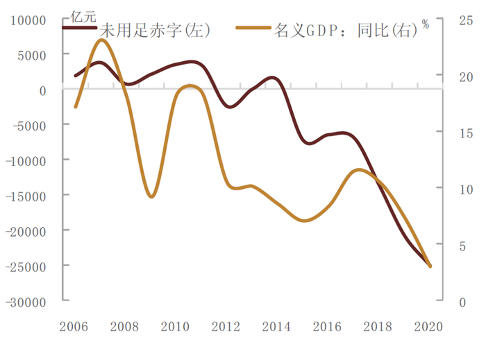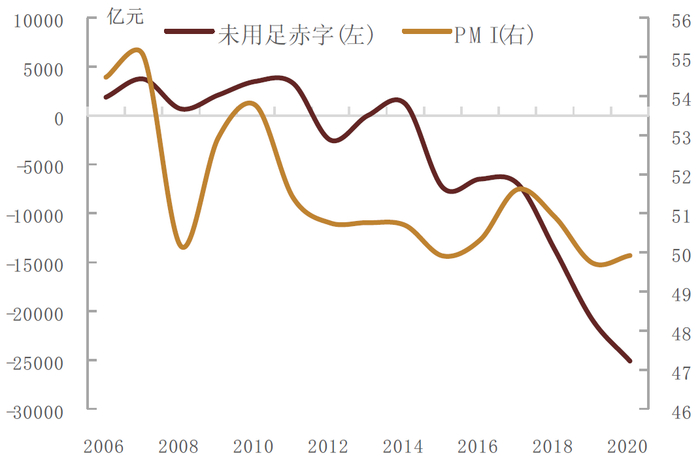可以看到,赤字剩余的年份,一般是经济增长较快的年份,例如2007年、2010-2011年;而赤字用足的年份,则一般是经济增长乏力,经济增速下行的年份,例如2008年、2015年、2018-2020年,对应着次贷危机、产能过剩、贸易摩擦以及新冠危机对经济的冲击。背后的逻辑也较好理解,在经济下行压力加大的时候,财政政策需要更加积极对冲经济下行压力,因此中央和地方也会尽力使用赤字加大财政支出;而在经济较好的年份,这种必要性就会下降。因此,可以看到PMI数据以及名义GDP增速均与当年剩余赤字水平高度相关(图1、2),这也体现了在经济景气度较高的时期赤字可能无需用完;而在经济景气度下行的时期,赤字会使用的更加充分。