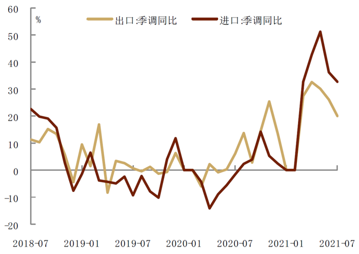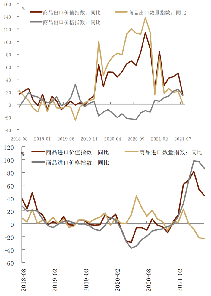 实体盈利方面,我们认为下半年我国的经常账户顺差可能会逐渐收窄,导致全年贸易顺差较去年压缩。受到变异病毒扩散影响,目前我国内需和外需均出现了放缓的迹象,因此7月我国进出口数据均出现了一定程度的放缓(图15)。但由于我国进口结构中以大宗商品为主,在大宗商品价格较为坚挺的情况下,我国进口价格增速仍明显高于出口价格增速(图16),因此进口增速回落的幅度不及出口,这将导致后面贸易顺差逐渐压缩(图17),我们预计全年的货物和服务贸易差额在1.8-2万亿元左右,较去年的2.7万亿元明显收窄。而今年的广义赤字较去年也明显压缩。去年名义广义赤字(一般预算内赤字+专项债+特别国债)在8.5万亿元左右,考虑专项债的实际净发行情况,去年广义赤字的实际规模在8.25万亿元左右。而今年由于预算内赤字和专项债额度都较去年有所下调,并且今年不再发行特别国债,因此今年年初预算的名义广义赤字降至7.22万亿元。鉴于目前来看,无论是一般预算赤字还是政府性基金赤字都可能低于年初目标,比如,我们预计年内国债净发行1.9-2万亿元左右(低于中央财政赤字2.75万亿元的规模),如果考虑专项债净增量也可能低于计划2000-4000亿元,那么今年实际的广义赤字可能从计划的7.22万亿元降至6万亿元甚至更低,直接比去年收缩2-3万亿元。