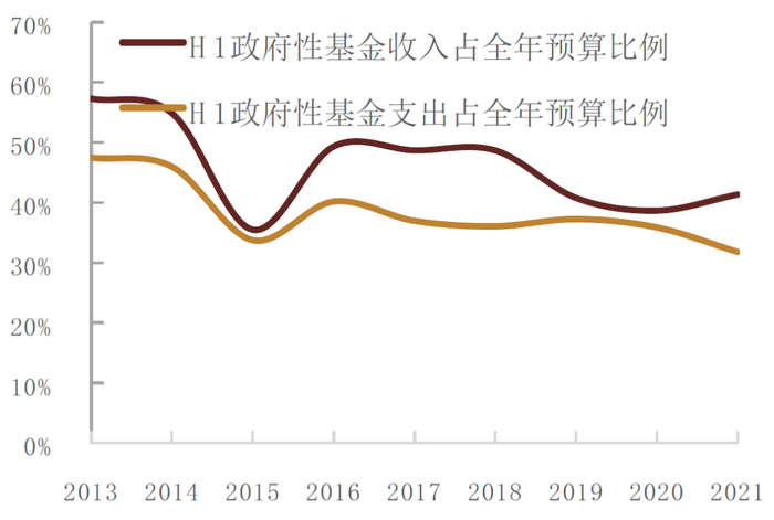 政府性基金支出偏慢可能也部分受到专项债发行偏慢的拖累。在专项债发行审批趋严的情况下,年初至今(截止8月13日)专项债净增在1.53万亿元左右,占到全年下达额度的42%左右,发行进度慢于去年。那么在上半年政府性基金支出低于预期的情况下,下半年地方债发行是否会明显提速,保证全年额度用完?我们认为可能不会。2021年7月20日,财政部召开2021年上半年财政收支情况新闻发布会[1],财政部相关负责人介绍,今年上半年地方政府债“发行进度较去年有所放缓,主要是今年专项债券恢复常态化管理,适当放宽地方发行时间要求,这样既不会影响重点项目建设进度和资金需求,也可以有效避免债券资金闲置。”同时,要求“继续完善政府债务管理机制,开好‘前门’、严堵‘后门’”,具体要求包括:“指导地方做好项目储备和前期准备等工作,加强对地方申报专项债券项目的把关,按照‘资金跟着项目走’的原则;实施专项债券项目穿透式监测;强化专项债券项目绩效管理;进一步推进地方政府债务信息公开”。整体来看,尽管上半年专项债发行明显低于预期,但下半年专项债相关政策并不会因此放松。专项债资金使用更为规范,强调要“增质提效”,避免资金的闲置和滥用,因此对地方上报项目的质量也提出了更高的要求。