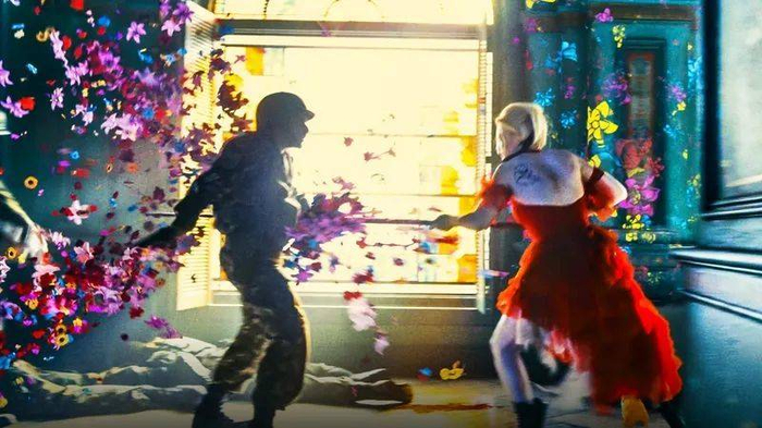底线更低的主角团成了Gunn发挥想象力的游乐场。这也造就了《X特遣队》和前作最直观的差别:颜色。《自杀小队》全片色调阴郁灰暗,其实也确实符合人物的“反派”调性,而在Gunn的镜头下,整部片子则色彩缤纷。虽然主角们仍然是杀人不眨眼的疯子,但他们杀戮的镜头都满溢着鲜艳的美感。