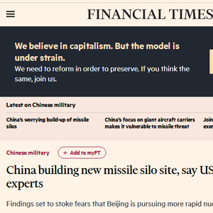 《金融时报》由此宣称,中国在内蒙古鄂尔多斯附近修建30个甚至更多可能的洲际导弹发射井、甘肃玉门和新疆哈密已经发现的洲际导弹发射井数量保守估计在230个以上,再加上解放军现有的洲际导弹部队,“中国陆基洲际导弹总数已经接近甚至超过美国目前部署的‘民兵3’洲际导弹数量。”报道甚至鼓吹,“《2020年中国军力报告》确定中国即将有两艘新型战略核潜艇服役,保守估计中国将至少装备20架轰-20隐形轰炸机,因此中国未来的战略核武器投送平台数量似乎与美国和俄罗斯相当”。