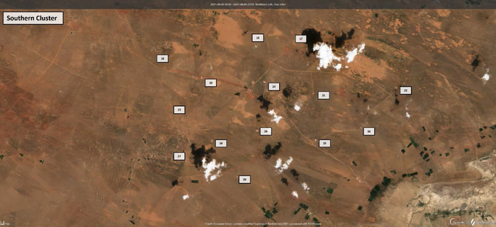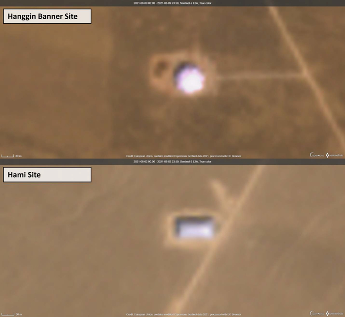 报道称,欧洲航天局卫星于2021 年 5 月 16 日至 8 月 9 日期间拍摄的卫星图像显示,鄂尔多斯附近的建筑工地与“此前在玉门和哈密发现的解放军洲际导弹发射井建筑工地非常相似”。卫星图像显示,当地至少正在修建29个发射井,它们集中分布在两个区域,其中北部15个,南部14个。