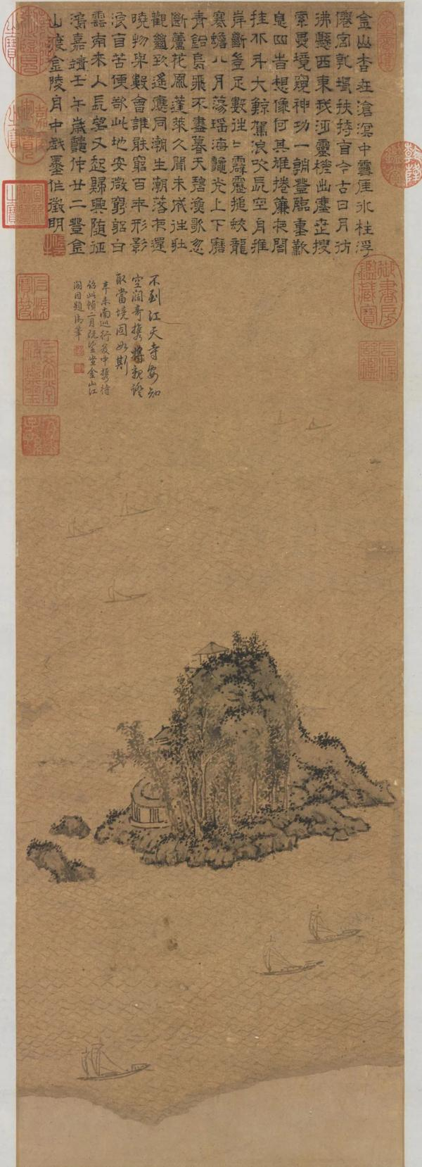 诗后同样用隶书题写了“嘉靖壬午岁秋仲廿二,登金山渡金陵舟中戏墨作,徵明。”此诗中使用了仙宫、出尘世、异境、神工、瑶海、蓬莱等描述仙境的语汇,它们和金山图像一起,将一个可以抵达的实景与出世的仙山结合为一。此幅绘画中处在水中央的金山形象与上面抄录的诗文相配,彰显了此地的仙山属性。