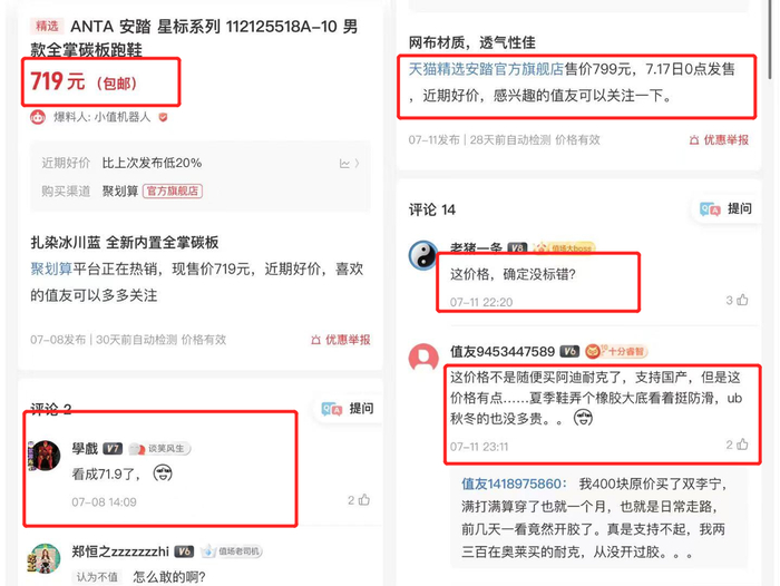 林兰兰以“安踏星标”这个高端系列举例,其实其内核与李宁的一些国潮款式类似,但是在“什么值得买”中,大家的普遍认为“价格标错了吧?”“它怎么敢”“支持不起国货了”。
