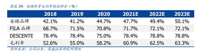 截至2021年上半年,安踏体育承担亚玛芬的亏损约4.4亿元,但是同比2020上半年的7.2亿元大幅收窄,此外,斐乐、迪桑特等运营成熟的高端线还在带着安踏的毛利率一路走高。国盛证券研报也显示,斐乐、迪桑特这两个高端品牌在未来三年毛利率会越来越高,为安踏的盈利能力“添砖加瓦”。