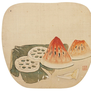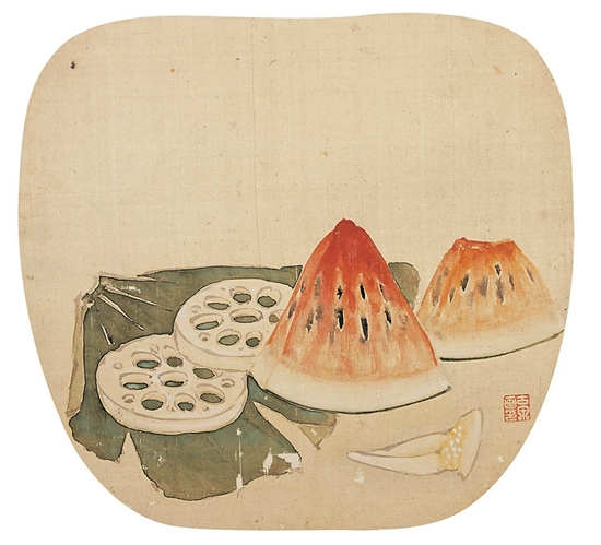 广府人有将荷叶作食材的习惯,用荷叶煲汤能消暑祛湿,也喜用荷叶包裹其他食材一起蒸煮,让荷叶独有的清香之气为食物增香。居廉选取荷叶与莲藕、西瓜组合成画,并不单单是为了色彩烘托,很可能就是日常生活的写照。画中的荷叶也许就是卖藕的小贩用以包裹莲藕,并顺道赠送给顾客的。