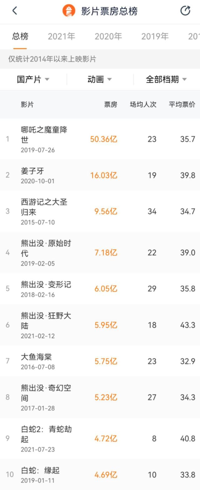 影史国产动画电影票房榜前十名单(数据来源:灯塔专业版)