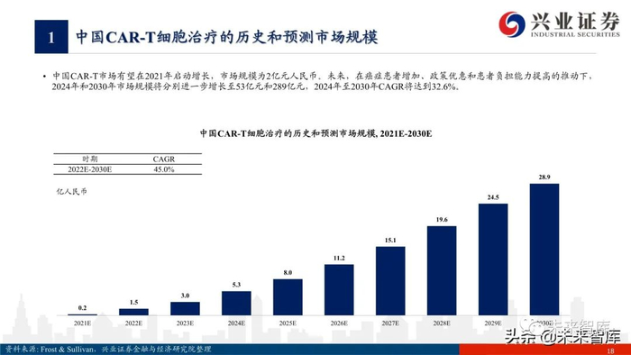 截至2021年5月,FDA已批准5款CAR-T治疗产品上市,其中4个靶向CD19靶点,1个靶向BCMA,均用于治疗血液瘤。2018至2020年,Kymriah的销售额由 0.76亿美元升至4.74亿美元,复合年增长率为149.74%;Yescarta的销售额由2.64亿美元升至5.63亿美元,复合年增长率为46.03%。随著更多细胞 免疫治疗产品获批,中国的细胞免疫治疗产品市场规模于2030年达人民币584亿元,2023年至2030年的复合年增长率为28.3%。