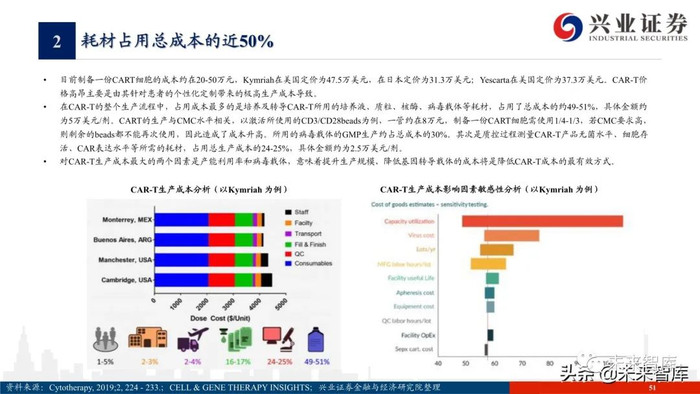 CAR-T细胞制备的成功率:诺华的工艺要求过高,加上产品上市后团 队解散,大量技术人员流失,制备成功率约只在50%;Yescarta在 ZUMA-1研究中的制备成功率约在90%。随着技术的不断成熟,现在 CAR-T制备的成功率能达到95%左右。