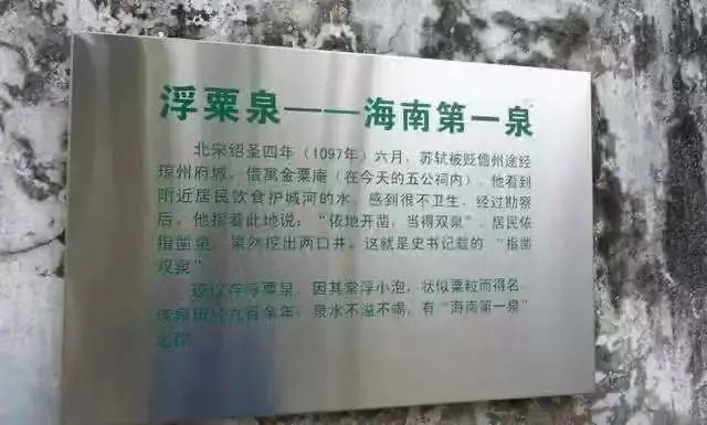 根据苏轼在《泂酌亭并叙》中的记载,下榻驿站的十余日内,他在城墙东北角发现了两个泉眼,这两个泉眼虽相距咫尺,味道却大不相同,其中一口泉眼泉水甘甜,适合饮用。他马上叫来村民并亲自指导开凿双泉,从此当地人民便有了甘甜可口的泉水饮用。该泉因水面经常浮现粟米状小泡而被命名为“浮粟泉”,是五公祠内留存遗迹之一。