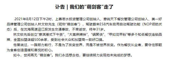 8月14日,一个名为“美一好”的个人公众号发布讣告称, 2021年8月12日下午2时,上善若水投资管理公司创始人、意统天下餐饮管理公司创始人、美一好品牌管理公司创始人林文钦(昵称“萌剑客”),驾驶蔚来ES8汽车启用自动驾驶功能(NOP领航状态)后,在沈海高速涵江段发生交通事故,不幸逝世,终年31岁。