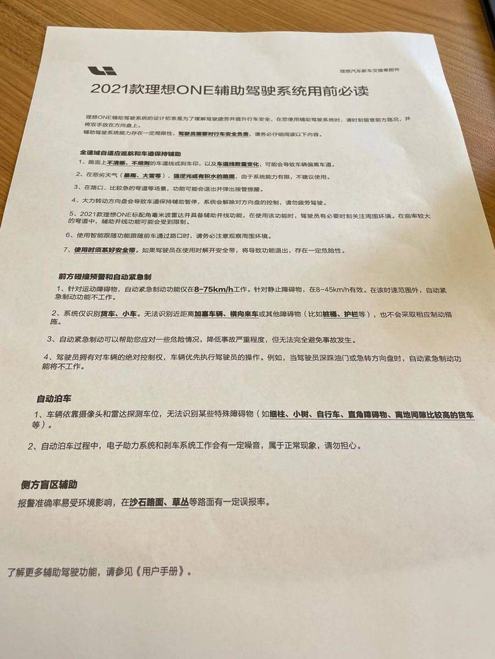 2021款理想ONE在交付用户时,需要经过两道教学。首先会在提车时交给用户一张“辅助驾驶必读”,在激活车辆后,必须观看辅助驾驶功能的视频,才能开启相关功能。
