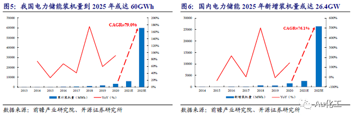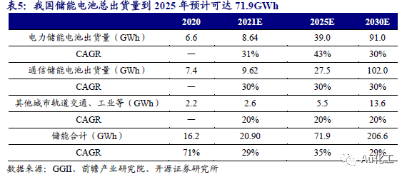 大力发展储能势在必行,储能行业将进入商业化加速期。由于新能源发电存在供应随机性,发电功率不稳定,并网困难等问题,导致我国弃风、弃水、弃光现象突出。在我国乃至全世界日益加大发展新能源产业的背景下,储能技术的突破和发展愈发重要。2021年7月15日,国家发展改革委和国家能源局发布《关于加快推动新型储能发展的指导意见》,并制定了发展目标:到2025年实现新型储能从商业化初期向规模化发展转变,装机规模达3000万千瓦以上;到2030年,实现新型储能全面市场化发展。新型储能将成为能源领域碳达峰碳中和的关键支撑之一。据GGII数据,2020年我国储能锂电池出货量达到16.2GWh,其中电力储能6.6GWh,通讯储能7.4GWh,其他包括城市轨道交通、工业等领域用储能锂电池2.2GWh,受国外需求拉动明显。又据前瞻产业研究院数据,2020年我国电力储能累计装机量3.3GWh,新增装机规模1.56GWh。结合到2025年装机规模达3000万千万的国家政策目标(假设以2小时配置,则“十四五”期间我国电力储能锂电池出货量将超过60GWh,而实际随着储能的大范围应用,配置时间将远超2小时),以及国内外需求,我们预计我国储能电池出货量有望大幅增长。