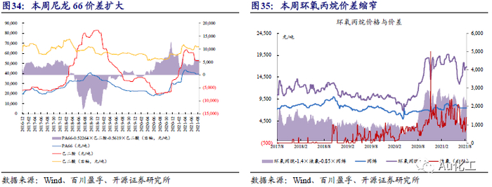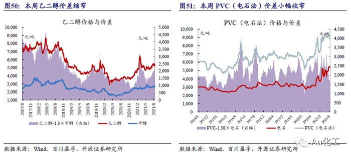 近7日我们跟踪的72种产品价差中,“环氧乙烷-0.73×乙烯”价差显著扩大;“二甲醚-1.41×甲醇”价差跌幅明显。