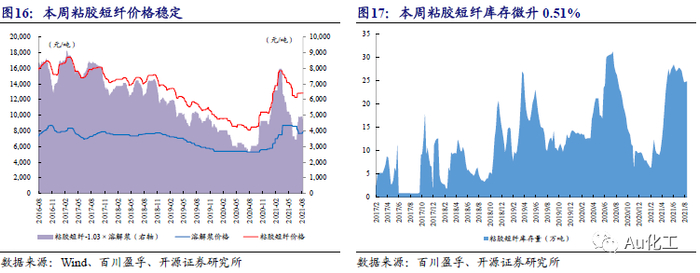 粘胶短纤:本周(8月9日-8月13日)粘胶短纤市场重心略有上行。据百川盈孚数据,本周粘胶短纤重心参考在13,200-13,600元/吨。根据我们测算,目前粘胶短纤价差为4,764.5元/吨,较8月6日减少154.5元/吨。下游人棉纱市场运行偏暖,人棉纱市场需求尚可。上游溶解浆价格变化不大,辅料价格继续攀升,行业成本震荡有涨。本周粘胶短纤行业开工率提升至77.42%,目前厂家主要以执行订单为主,由于疫情持续发酵,国内多地运输受阻,厂家库存略有提升。截至2021年8月13日,粘胶短纤库存约24.90万吨,较8月6日小幅上升0.51%。我们认为,粘胶短纤已处于底部,建议积极配置,我们继续看好粘胶短纤龙头三友化工。受益标的:三友化工。