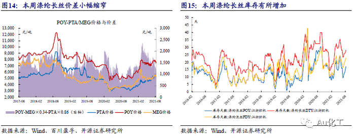 涤纶长丝:本周(8月9日-8月13日)涤纶长丝价差小幅缩窄。本周涤纶长丝市场市场价差小幅缩窄,2021年8月13日,涤纶长丝POY价格报7,475元/吨,较8月6日下降250元/吨;8月13日,涤纶长丝价差为1,161.9元/吨,较8月6日减少37.9元/吨。根据Wind数据,截至8月12日,涤纶长丝POY库存天数为17.2天,较8月5日上升1.8天;DTY库存天数为28.2天,较8月5日上升1.4天;FDY库存天数为23.0天,较8月5日上升1.2天。