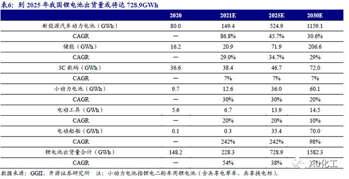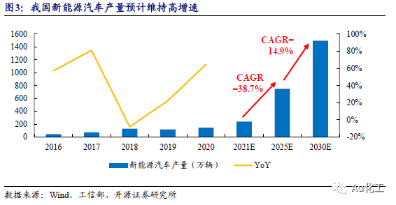 新能源汽车渗透率提升空间大,将带动上游材料同步发展。2020年11月,国务院办公厅印发《新能源汽车产业发展规划(2021—2035年)》,目标到2025年,我国新能源汽车市场竞争力明显增强,新能源汽车新车销售量达到汽车新车销售总量的20%左右。2020年,我国新能源汽车产量达145.6万辆,渗透率仅为5.9%,结构性增长空间很大。根据中国汽车工业协会统计,2021年上半年,新能源汽车产销分别完成121.5万辆和120.6万辆,同比均增长2倍,超过市场预期。据GGII数据,2020年我国汽车动力电池出货量为80GWh,2021年上半年产量为74.7GWh。我们预计2021全年汽车动力电池产量为149GWh,并假设未来产量增速与新能源汽车产量增速相同。同时,我国电动车单车平均带电量也有较大提升空间。