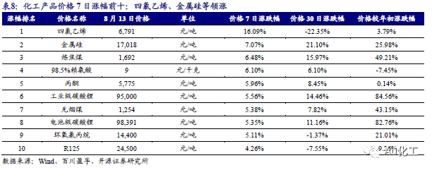 3.1、本周化工品价格涨跌排行:四氯乙烯、金属硅等领涨