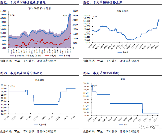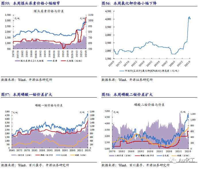 纯碱:本周(8月9日-8月13日)纯碱市场价格继续走高。根据百川盈孚与卓创资讯,本周中东部地区汽运仍显不畅,部分企业出货稍有影响。但个别企业停工检修,或因环保、限电、装置故障等因素的影响低产延续,企业库存仍处于历史低位,市场整体货源持续紧张。截至2021年8月12日,本周中国轻质纯碱市场均价为2,184 元/吨,较上周相比上涨3.51%;重质纯碱市场均价为 2,401元/吨,较上周相比上涨3.14%。受益标的:三友化工、远兴能源、山东海化、云图控股、中盐化工、和邦生物、华昌化工、金晶科技等。
