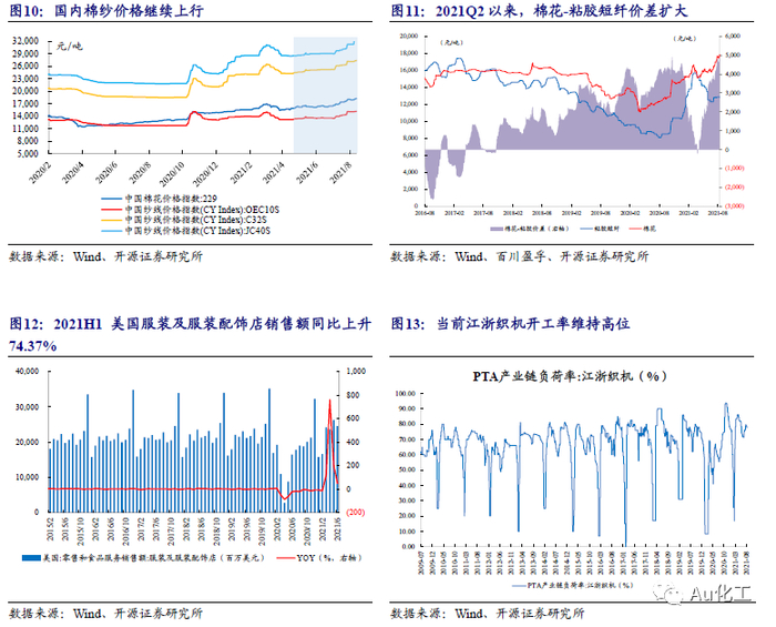 国内棉纱价格持续上行,行业景气度提升明显。自2021年4月初以来,国内棉花、纱线价格开启上行通道,4月底新疆雨雪天气影响新棉种植,同时市场预期印度疫情高危将导致订单回流,下游提前补货带动纺企产销放量,带动棉纱价格上行。根据Wind数据,中国纱线价格指数OEC10S/C325/JS40S分别报15,200/27,430/32,500元/吨。据我们测算,8月13日“棉花-粘胶短纤”价差为5,000元/吨。海外纺织订单回流,化纤板块迎来配置良机。根据Wind数据,2021上半年,美国服装及服装配饰店销售额为1,308.61亿美元,同比增加74.37%,较2019年同期增长7.38%,自疫情以来连续4个月大幅转正,海外需求仍在。另外,近期因德尔塔病毒国际防疫形势再趋严峻,据中国纺织品进出口商会报道,受疫情影响越南大量纺企停产,其中南越地区97%的纺织企业暂停生产;印度、孟加拉也深受疫情影响,据印媒报道,一些跨国服装零售商已将15-20%的订单转移至其他国家。印度、越南、孟加拉等东南亚纺织大国在疫情的打击下纺织产业几近停摆,这些订单或将回流至疫情控制出色、拥有完备纺织产业链的中国。我们认为随着海外刚需的复苏,以及疫情的不断反复,能够稳定供应全球的中国纺服产业链景气度将会回升。我们坚定看好2021年中国化纤企业将继续稳定供应全球,并充分受益于全球纺织服装需求复苏,近期化纤板块的回调带来配置良机。