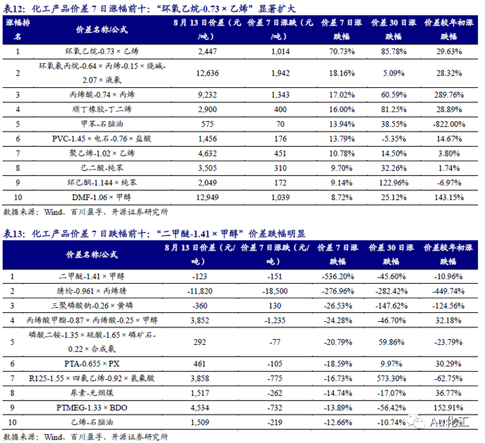 4.2、本周价差涨跌排行:“环氧乙烷-0.73×乙烯”价差显著扩大;“二甲醚-1.41×甲醇”价差下降明显