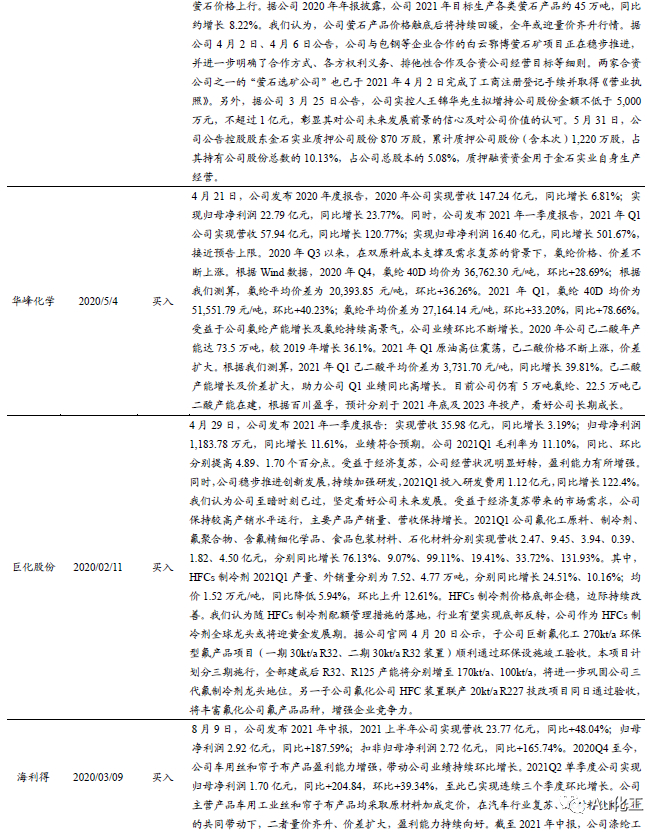 受益标的:【化纤组合】三友化工、新凤鸣、华峰化学;【子行业龙头】金石资源、巨化股份、三美股份、云图控股、滨化股份、山东海化、鲁西化工、和邦生物、海利得、江苏索普、利民股份;【化工龙头白马】恒力石化、赛轮轮胎、万华化学、扬农化工、华鲁恒升、新和成、荣盛石化。